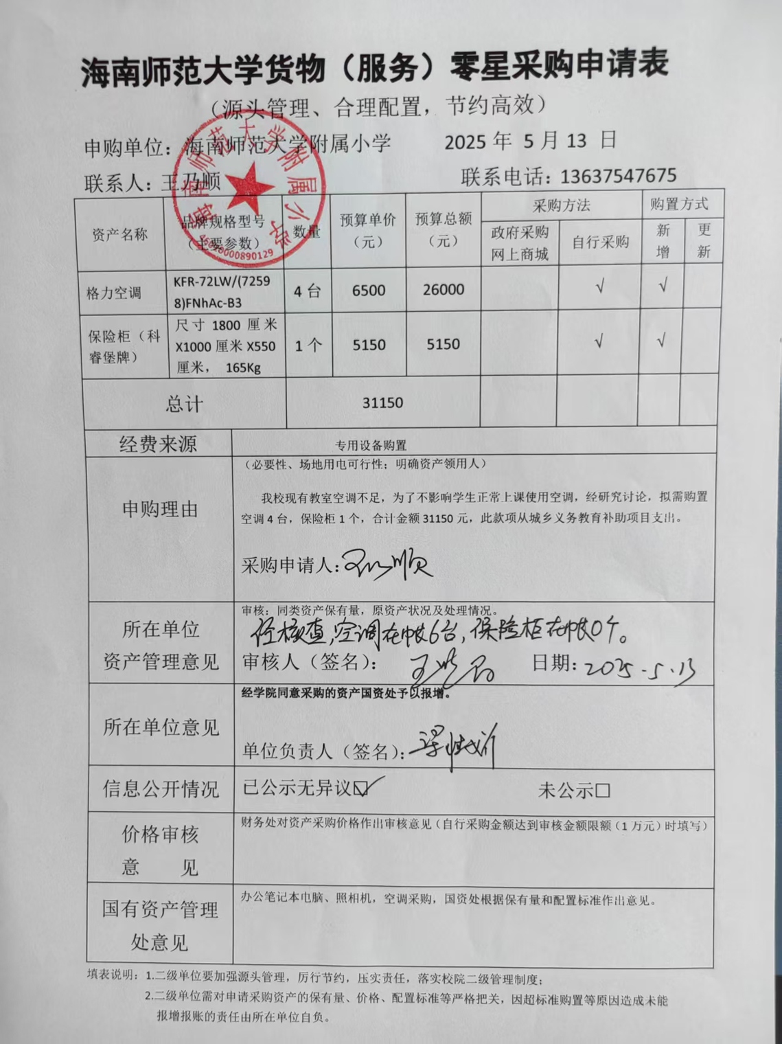 久久小说 现有教室空调不足,为了不影响学生正常上课使用空调,经研究讨论,拟需购置空调4台,保险柜1个,合计金额31150元。