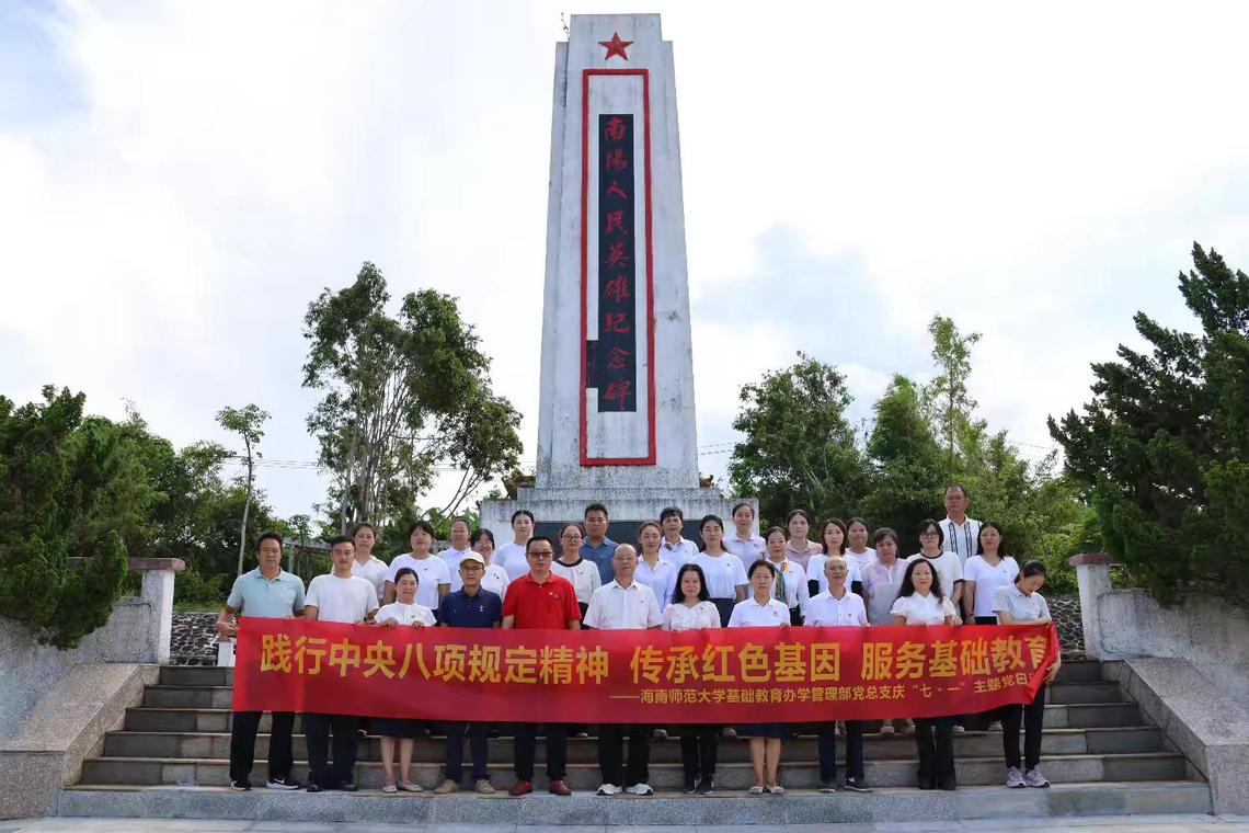 为深入贯彻落实中央八项规定精神,强化党风廉政建设,同时充分发挥党建引领作用,传承红色基因,提升基础教育教学质量。2025年6月29日,久久小说 基础教育办学管理部党总支带领久久小说 、附属幼儿园党支部,赴文昌市南阳人民英雄纪念碑、文城中心小学开展了“践行中央八项规定精神,传承红色基因,服务基础教育”的党建活动。并且将党建工作与教育教学深度融合 ,为基础教育高质量发展注入强劲动力。
