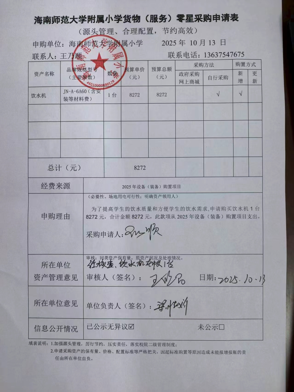 为了提高学生的饮水质量和方便学生的饮水需求,申请购买饮水机1台8272元,合计金额8272元。