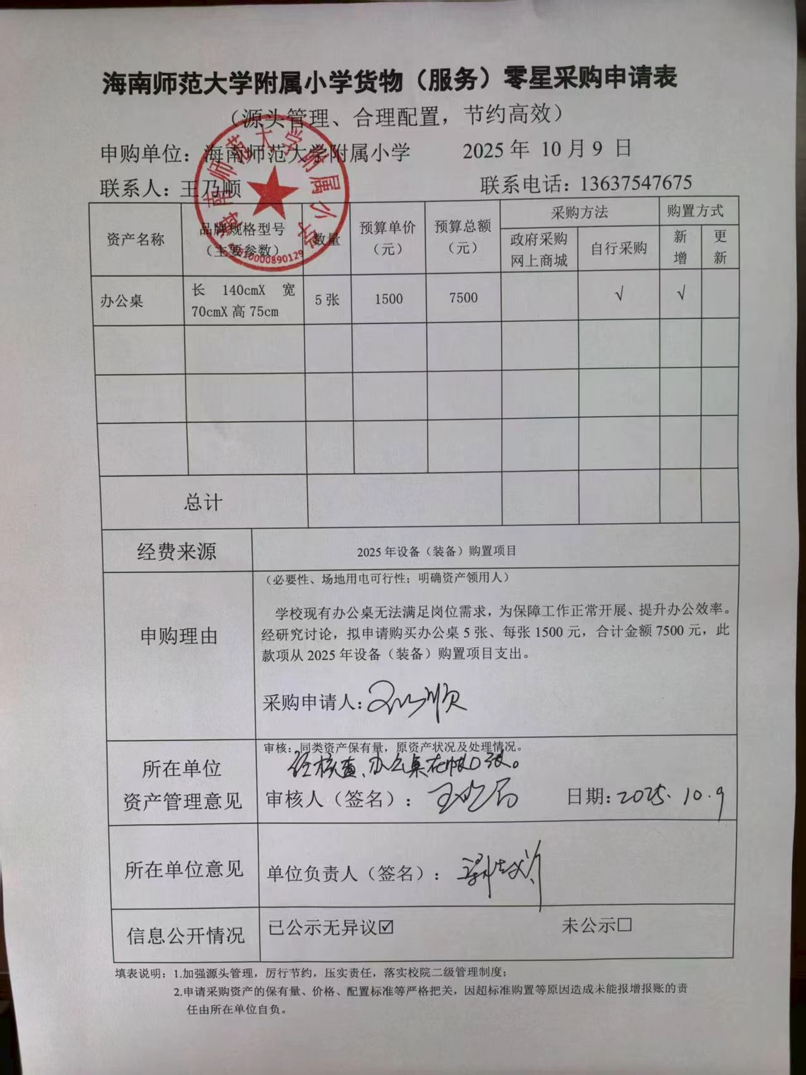 学校现有办公桌无法满足岗位需求,为保障工作正常开展、提升办公效率。经研究讨论,拟申请购买办公桌5张、每张1500元,合计金额7500元。