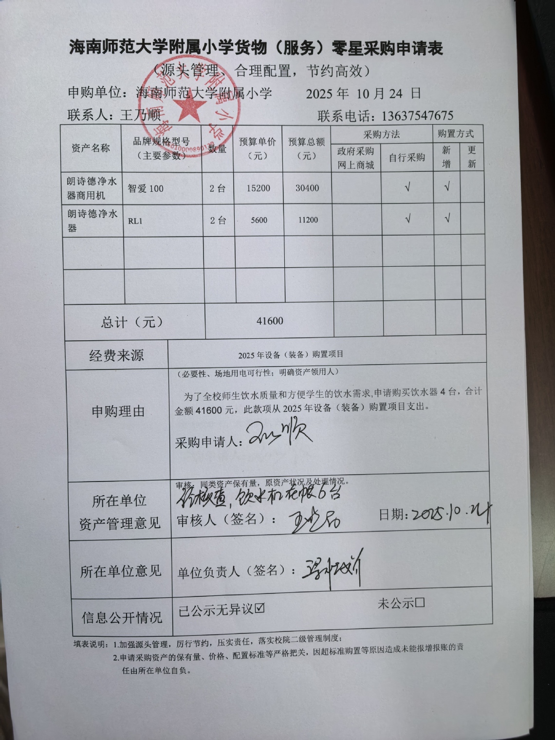 为了全校师生饮水质量和方便学生的饮水需求,申请购买饮水器4台,合计金额41600元。