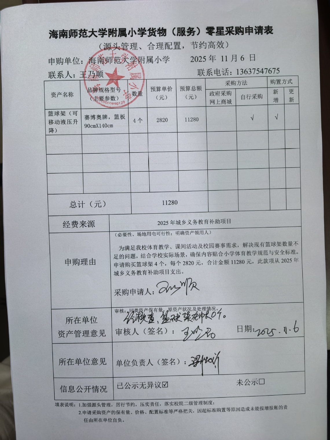为满足久久小说 体育教学、课间活动及校园赛事需求,解决现有篮球架数量不足的问题,结合学校实际场景,确保内容贴合小学体育教学规范与安全标准。申请购买篮球架4个,每个2820元,合计金额11280元。